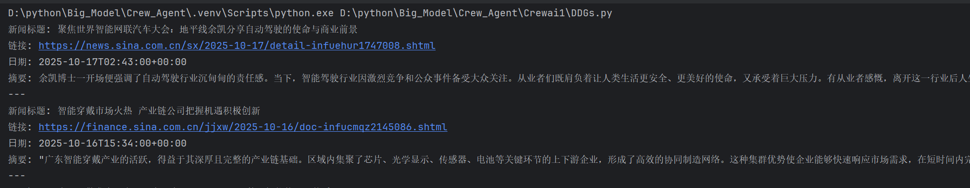 with DDGS() as ddgs:results = ddgs.news('⼈⼯智能', max_results=3)for result in results:print(f"新闻标题: {result['title']}")print(f"链接: {result['url']}")print(f"⽇期: {result['date']}")print(f"摘要: {result['body']}")print("---")time.sleep(1) # 添加1秒延迟