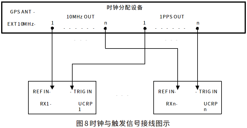 ⽤同轴线缆连接时钟分配设备的1 0 M H z输出⼝到U C R P 4 3 2 0 的R E F I N端⼝,连接P P S O U T⼝到UCRP4320的TRIG In端口。