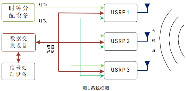 宽带多通道同步采集系统基于信号同步技术,主要包含3台USRP采集设备、1台时钟分配设备、1台数据交换 设备、1台信号处理设备、3套阵列天线,系统框图如下图所示。