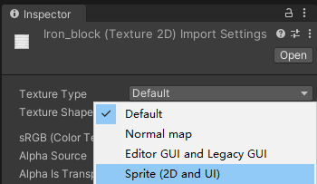 建议都放在Texture文件夹里面,注意了,此时的图片文件还不能正常使用,我们点击一个图片文件,在inspector窗口里面把 Texture Type改成Sprite(2D and UI),这样后期我们可以改白色部分的颜色