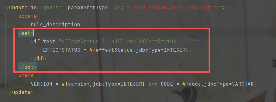 报错信息的sql日志为:update rule_description where version = x and code = 'xxx',发现没有拼接if标签中的sql语句。