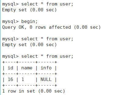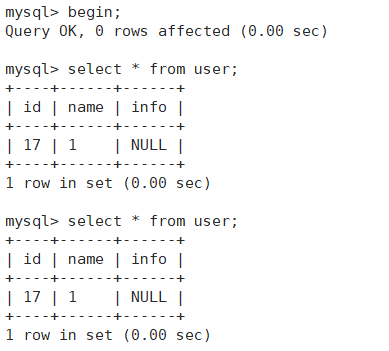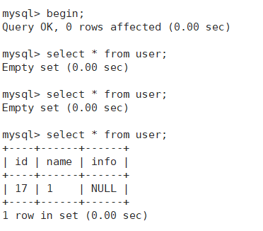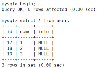 1.右侧开启事务之后就进行读取,发现只有一个数据。