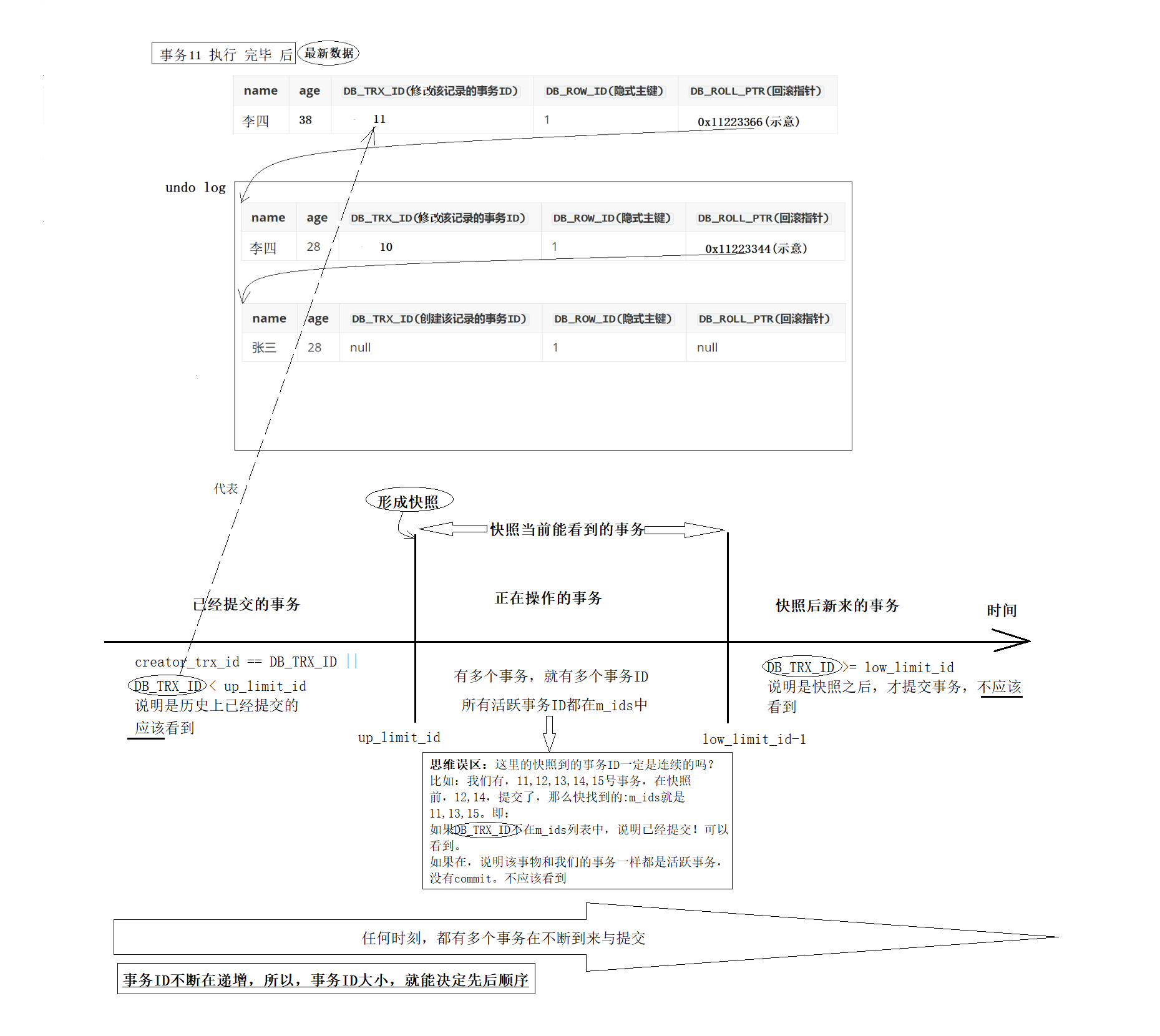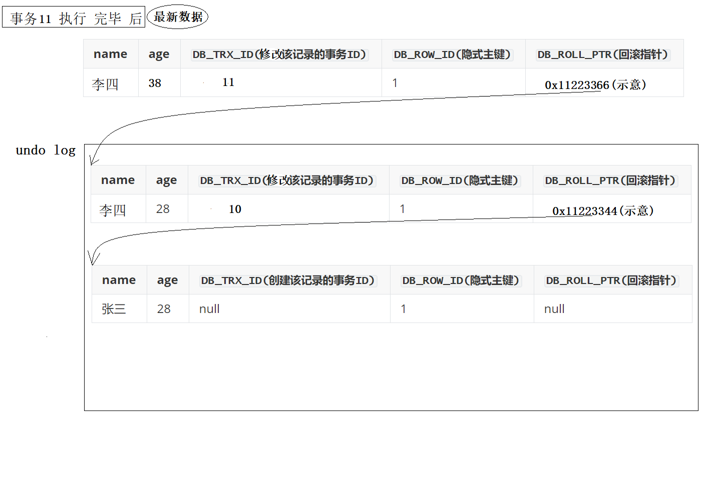 因此,我们在事务执行过程中,这三个隐藏参数变化如下