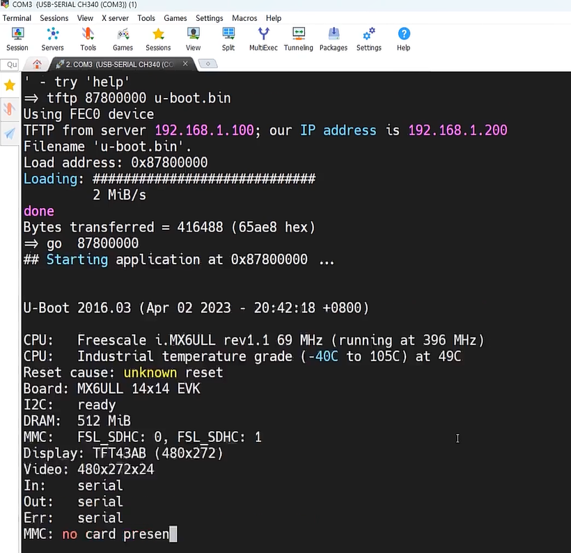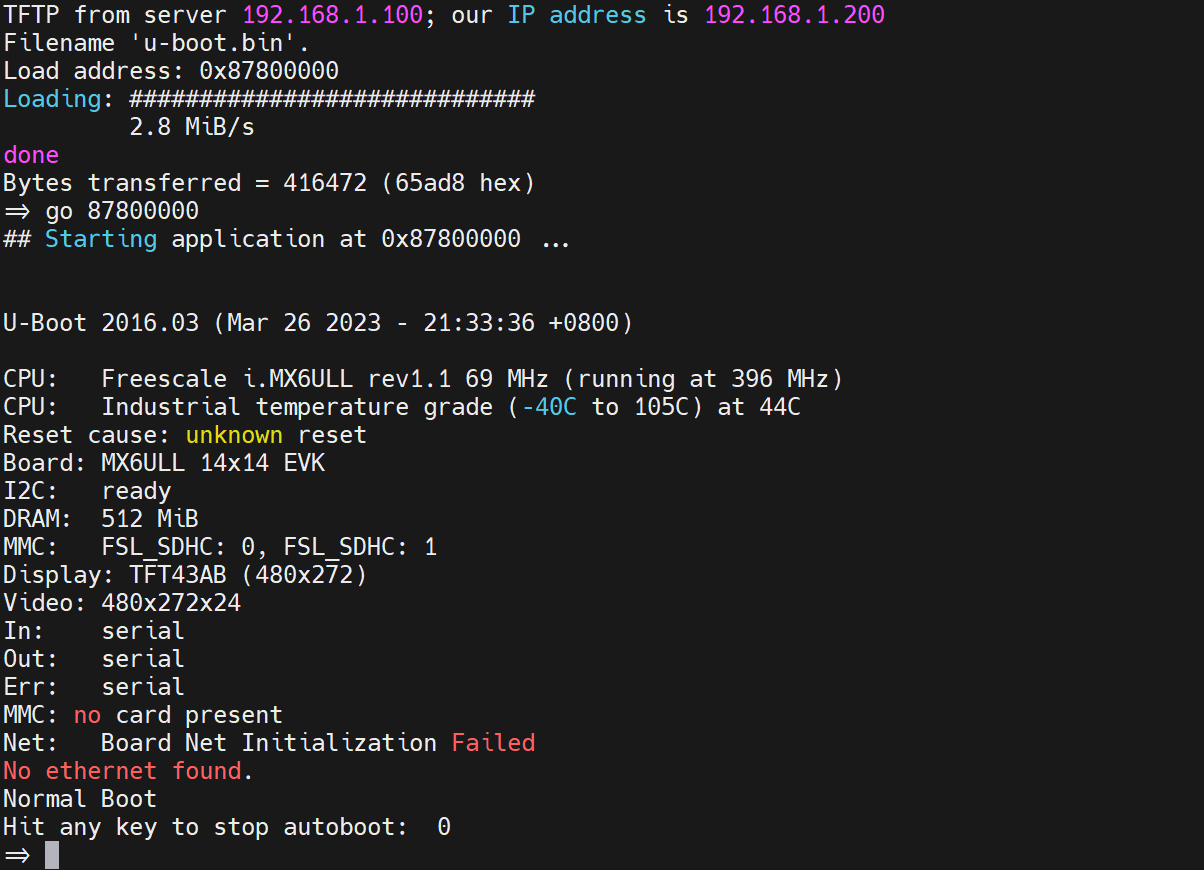将源码目录下的u-boot.bin到tftpboot目录下,然后通过开发板上的u-boot通过tftp下载测试: