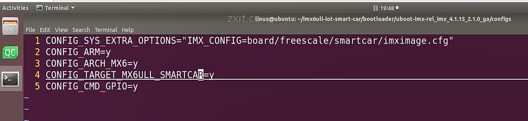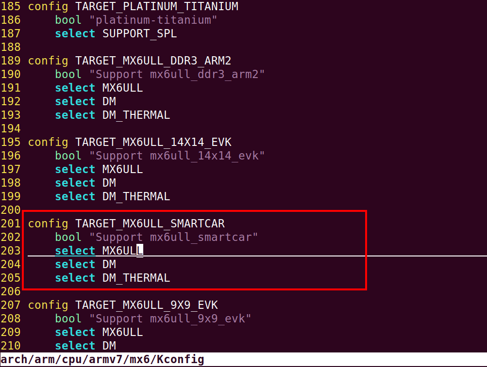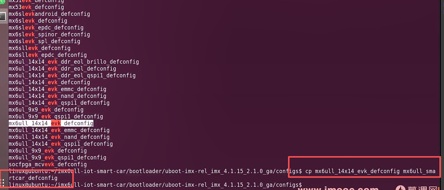 在u-boot源码下的configs目录下添加mx6ull_smartcar_defconfig配置文件