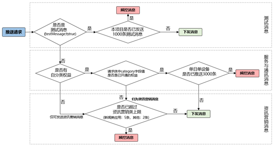 推送服务针对消息发送的不同阶段、不同场景、不同消息类型,制定了不同的消息频控规则。