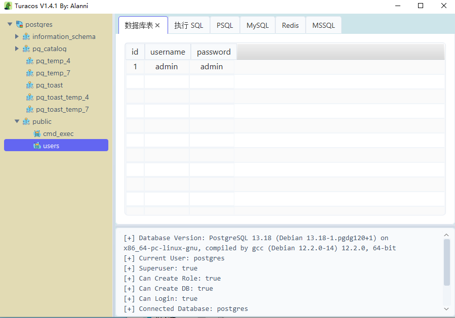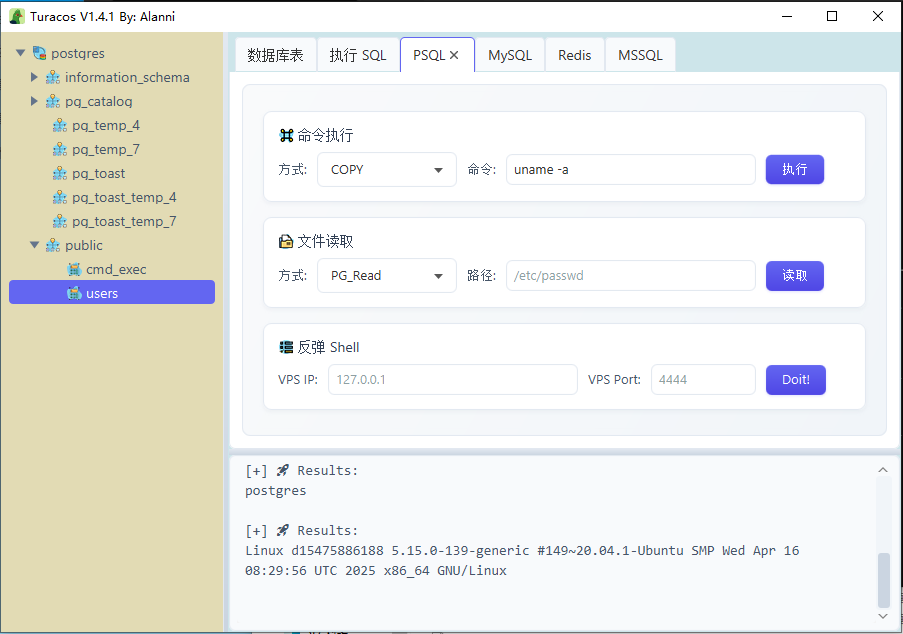Turacos 是一款专业的多数据库安全评估工具,支持 PostgreSQL、MySQL、Redis、MSSQL 等多种数据库的后渗透操作。为安全研究人员提供系统化、模块化的数据库安全测试能力,助力企业安全评估与漏洞验证。