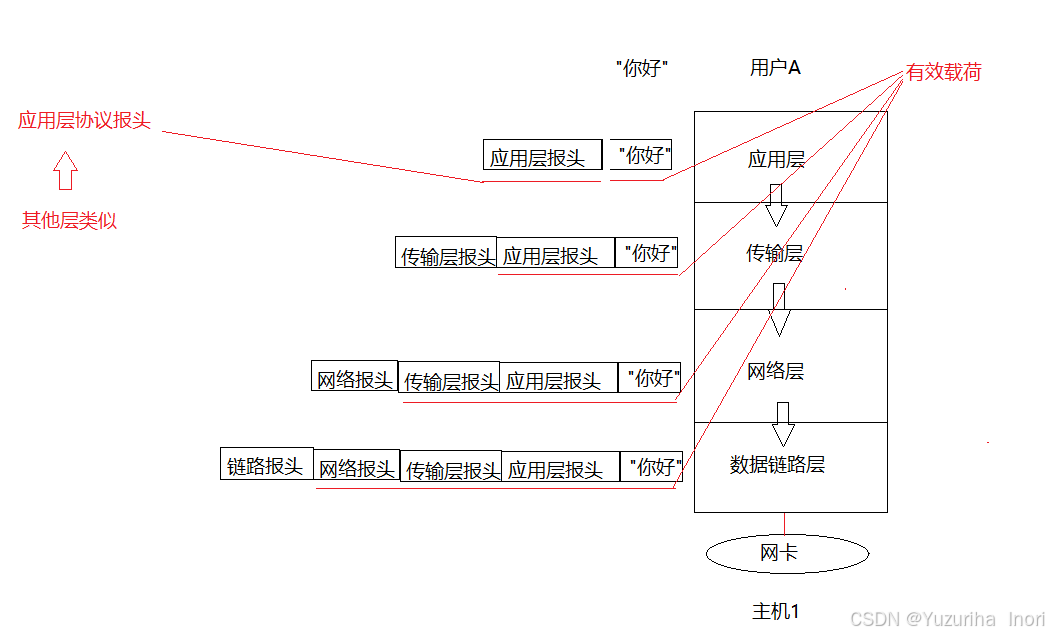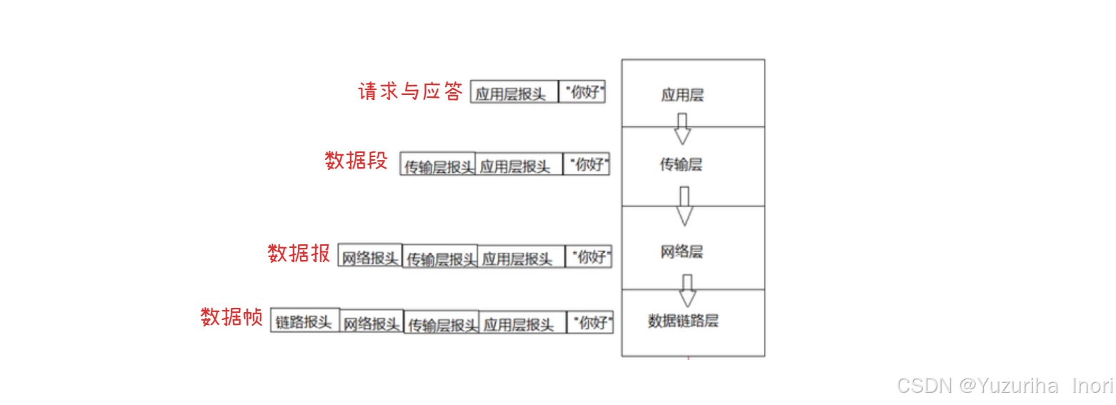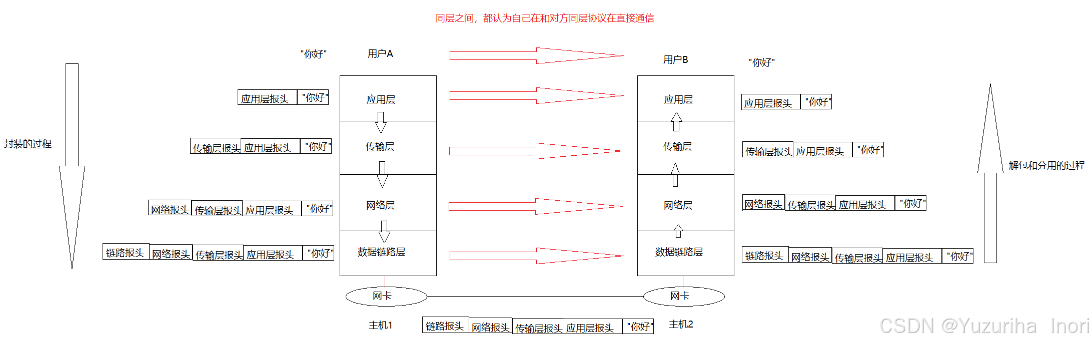 在网络传输的过程中,数据不是直接发送给对方的,而是先自上而下的将数据交付给下层协议,最后由网卡发送,然后对方在通过网卡接收,再自底向上进行解包,获取数据。