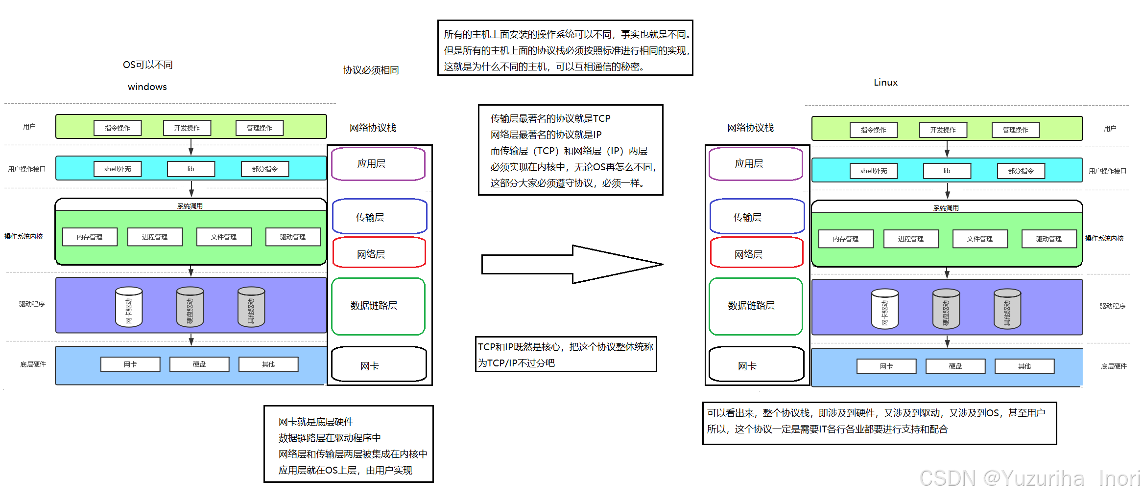 我们可以看到协议栈涉及了:底层硬件、驱动程序、操作系统以及用户,这就意味这要执行该协议就想要IT的各行各业都参与进来。而所有的操作系统都遵守这个协议,这也是为什么不同的操作系统之间可以相互通信的秘密!