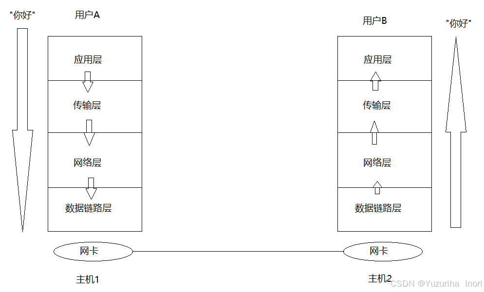 如图。用户A与用户B想要通信,是依靠底层硬件:网卡来实现的。