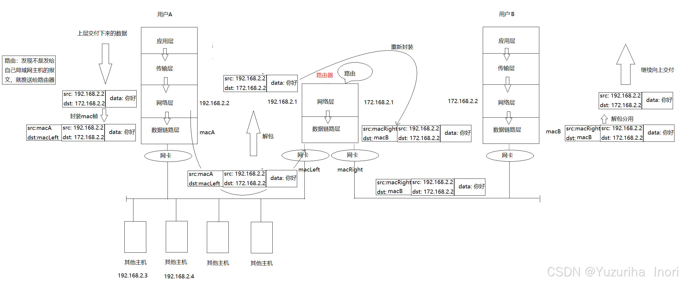4. 路由器的网络层检查IP数据报的目的IP(172.168.2.2),发现该地址不属于当前的192.168.2.0网段,于是决定进行路由转发。接着,路由器的数据链路层对该IP数据报重新封装,生成新的MAC帧。新MAC帧的源MAC地址为路由器右侧接口的MAC地址(macRight),目的MAC地址为用户B的网卡地址(macB),帧的数据部分依旧是原来的IP数据报(源IP、目的IP、“你好”均未改变)。 |