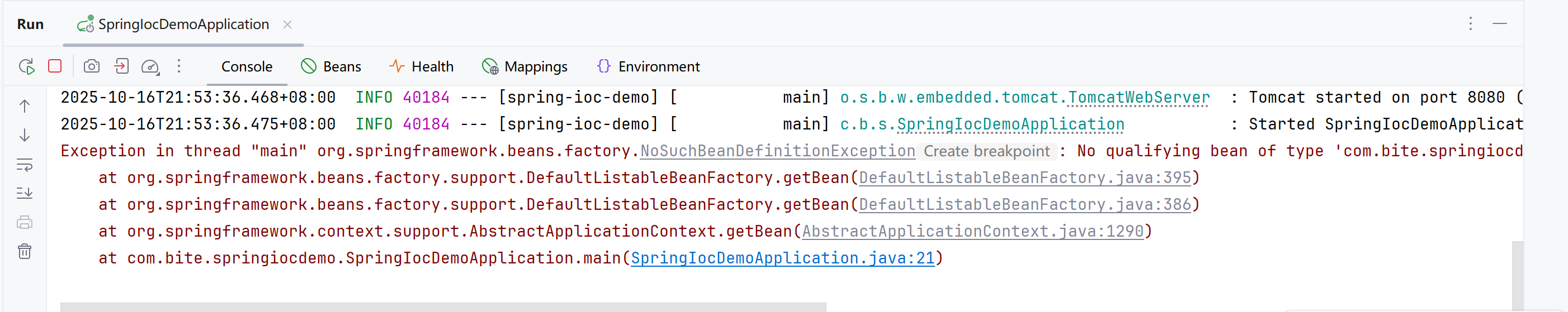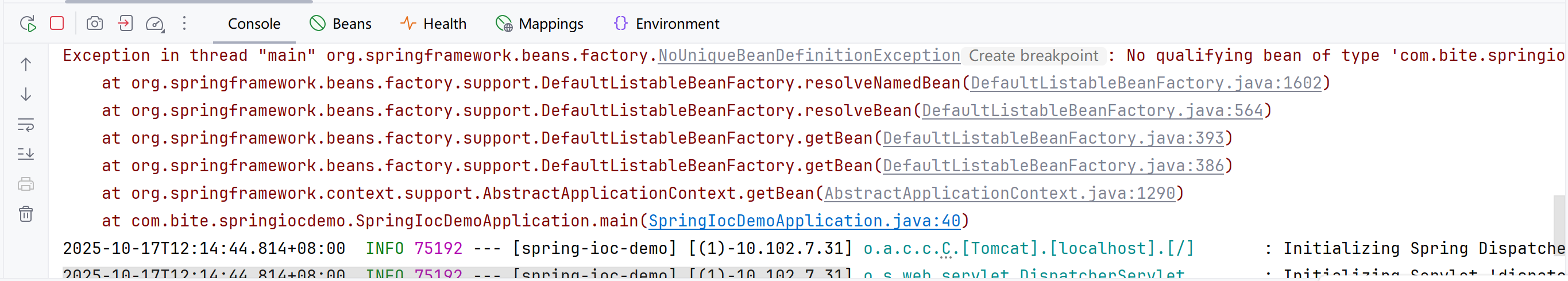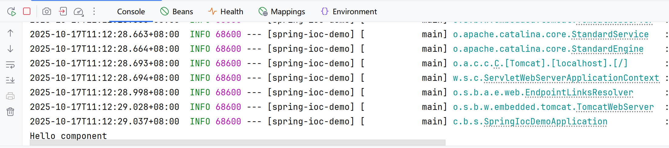 public class SpringIocDemoApplication {public static void main(String[] args) {ApplicationContext context = SpringApplication.run(SpringIocDemoApplication.class, args);UserComponent bean = context.getBean(UserComponent.class);bean.print();}