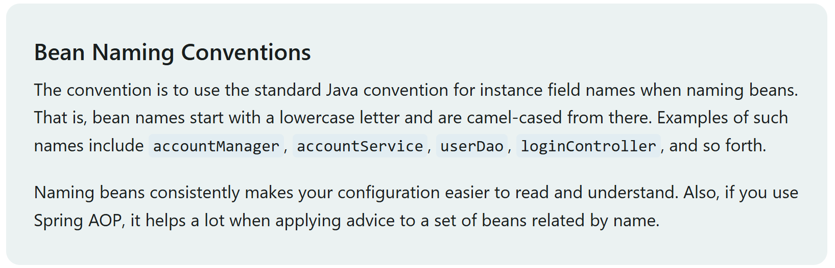 命名约定使用Java标准约定作为实例字段名。也就是说,bean名称以小写字母开头,然后使用驼峰式大小写。
