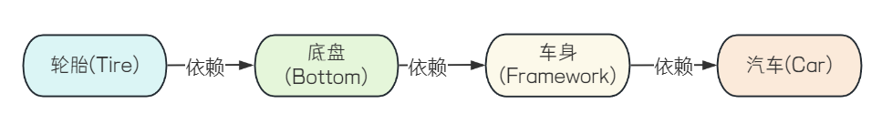 先设计轮子(Tire),然后根据轮子的大小设计底盘(Bottom),接着根据底盘设计车身(Framework),最后根据车身设计好整个汽车(Car)。这里就出现了一个“依赖”关系:汽车依赖车身,车身依赖底盘,底盘依赖轮子。