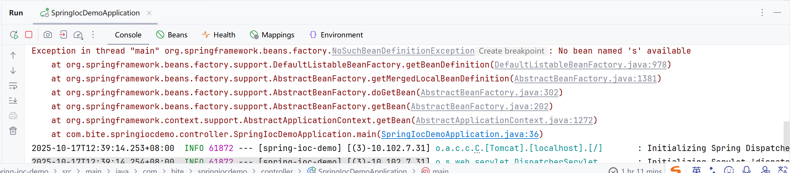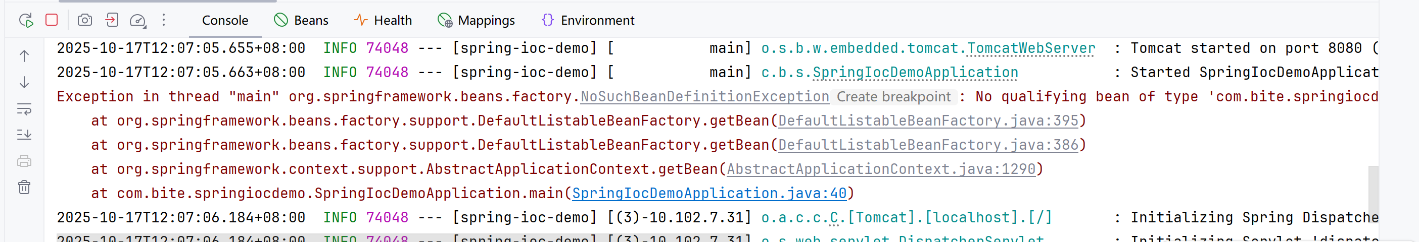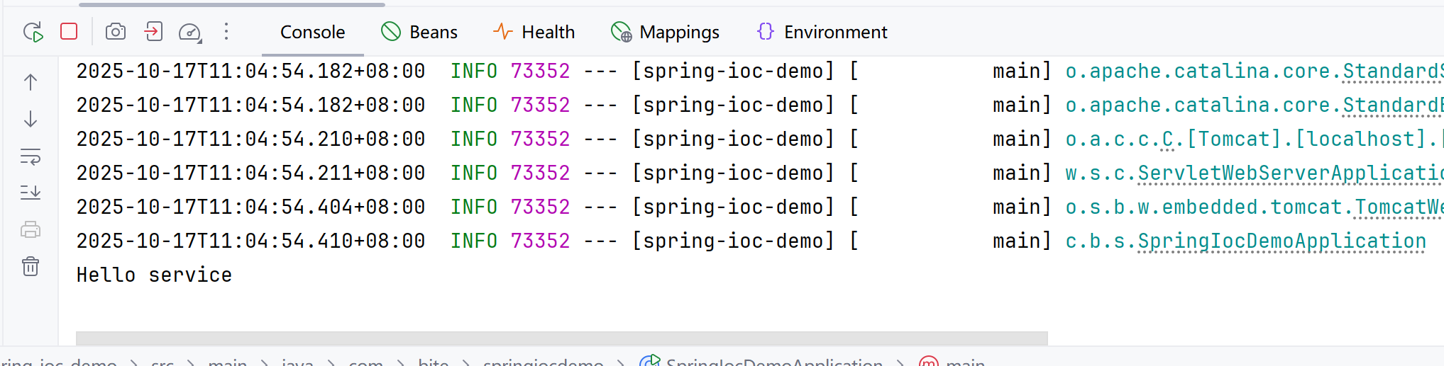 public class SpringIocDemoApplication {public static void main(String[] args) {ApplicationContext context = SpringApplication.run(SpringIocDemoApplication.class, args);UserService bean = context.getBean(UserService.class);bean.print();}