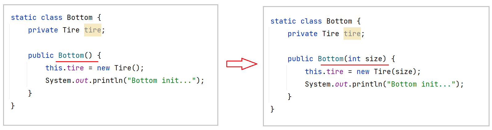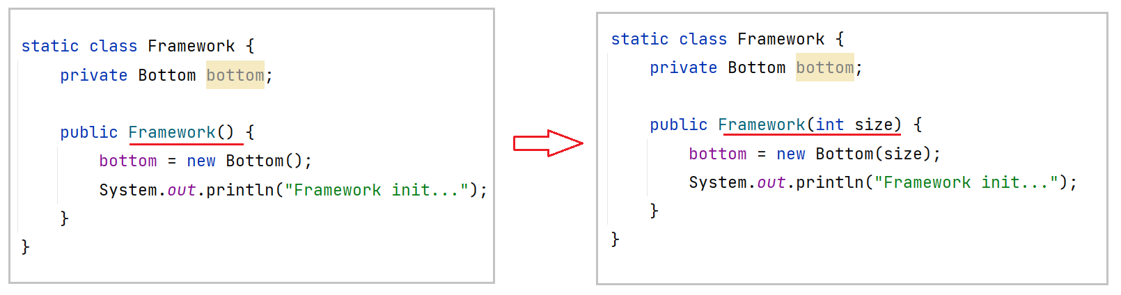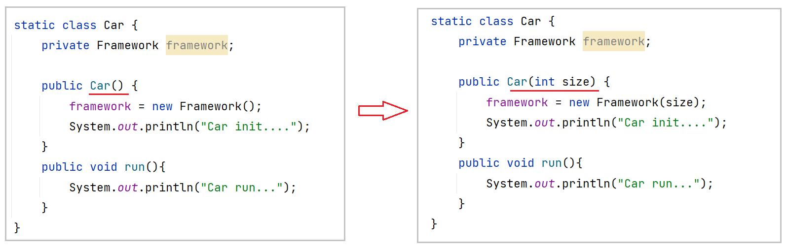 我们可以尝试不在每个类中自己创建下级类,如果自己创建下级类就会出现当下级类发生改变操作,自己也要跟着修改。此时,我们只需要将原来由自己创建的下级类,改为传递的方式(也就是注入的方式),因为我们不需要在当前类中创建下级类了,所以下级类即使发生变化(创建或减少参数),当前类本身也无需修改任何代码,这样就完成了程序的解耦。