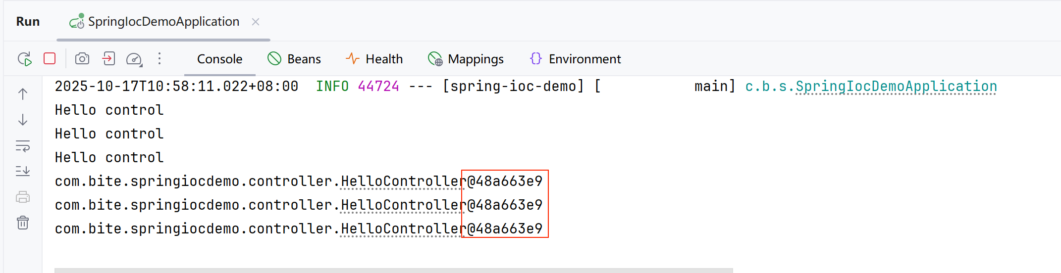public class SpringIocDemoApplication {public static void main(String[] args) {ApplicationContext context = SpringApplication.run(SpringIocDemoApplication.class, args);HelloController bean = context.getBean(HelloController.class);bean.print();HelloController bean2 = (HelloController) context.getBean("helloController");bean2.print();HelloController bean3 = context.getBean("helloController", HelloController.class);bean3.print();System.out.println(bean);System.out.println(bean2);System.out.println(bean3);}