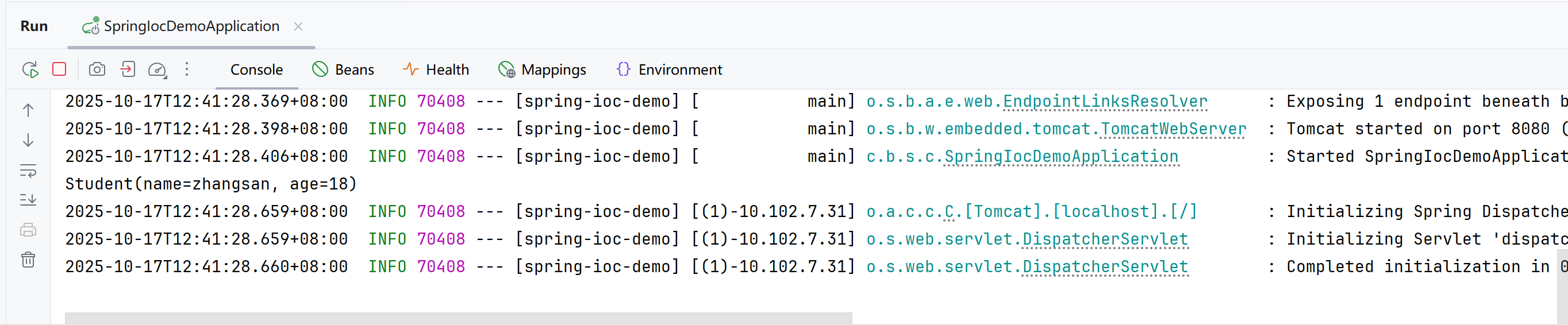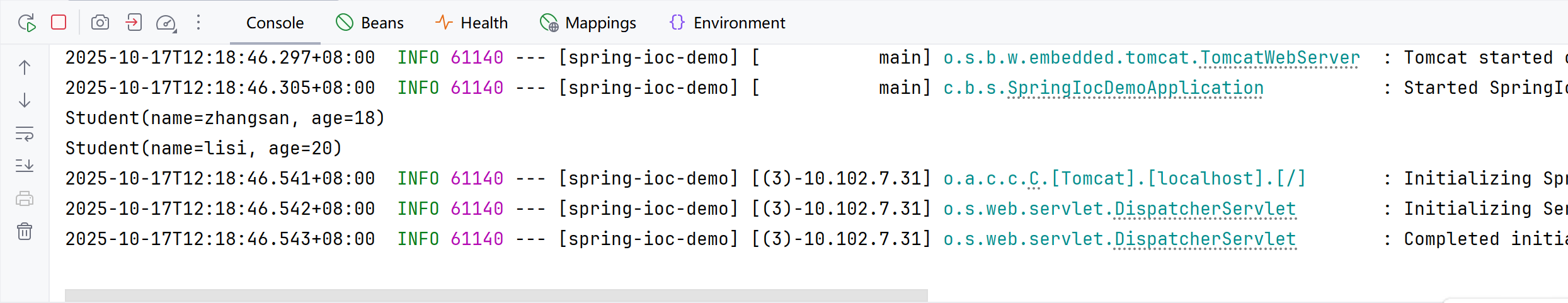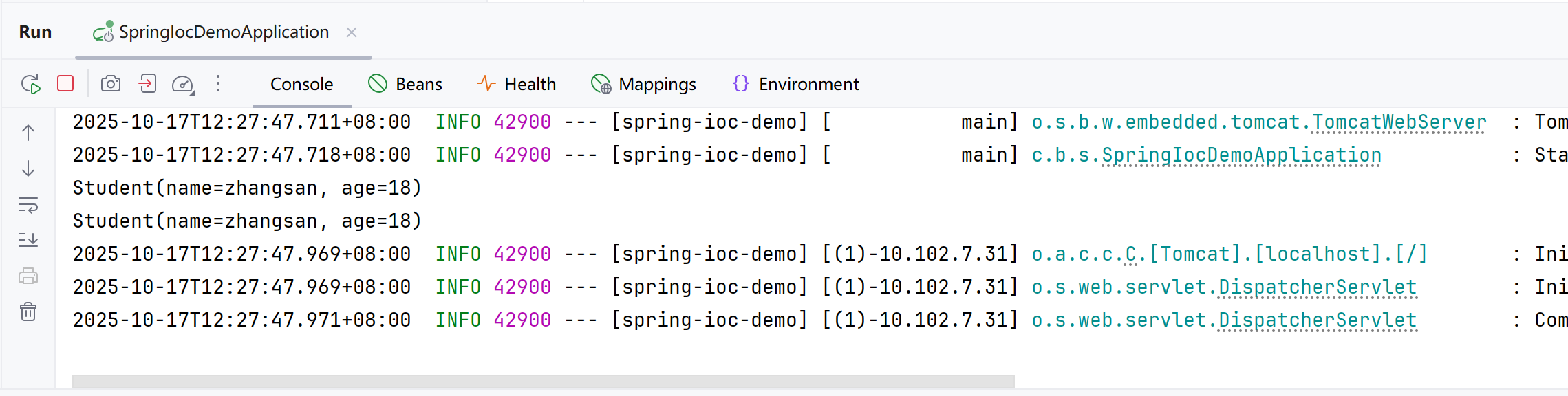 public class SpringIocDemoApplication {public static void main(String[] args) {ApplicationContext context = SpringApplication.run(SpringIocDemoApplication.class, args);//根据Bean名称,从Spring上下文获取对象Student student1 = (Student) context.getBean("student1");Student student2 = (Student) context.getBean("student2");System.out.println(student1);System.out.println(student2);}