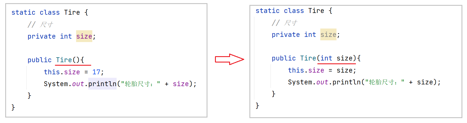 public class NewCarExample {public static void main(String[] args) {Car car = new Car();car.run();}/*** 汽车对象*/static class Car {private Framework framework;public Car() {framework = new Framework();System.out.println("Car init...");}public void run() {System.out.println("Car run...");}}/*** 车身类*/static class Framework {private Bottom bottom;public Framework() {bottom = new Bottom();System.out.println("Framework init...");}}/*** 底盘类*/static class Bottom {private Tire tire;public Bottom() {this.tire = new Tire();System.out.println("Bottom init...");}}/*** 轮胎类*/static class Tire {// 尺寸private int size;public Tire() {this.size = 17;System.out.println("轮胎尺寸: " + size);}}