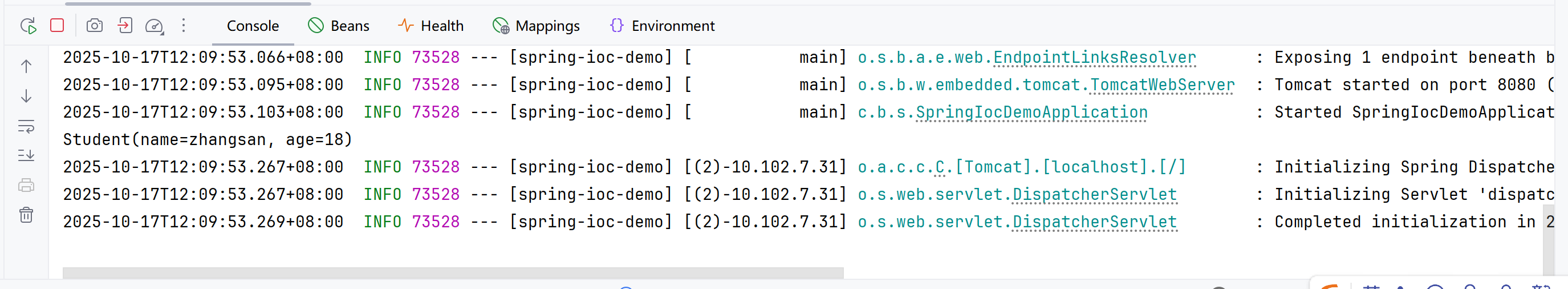 public class SpringIocDemoApplication {public static void main(String[] args) {ApplicationContext context = SpringApplication.run(SpringIocDemoApplication.class, args);Student student = context.getBean(Student.class);System.out.println(student);}