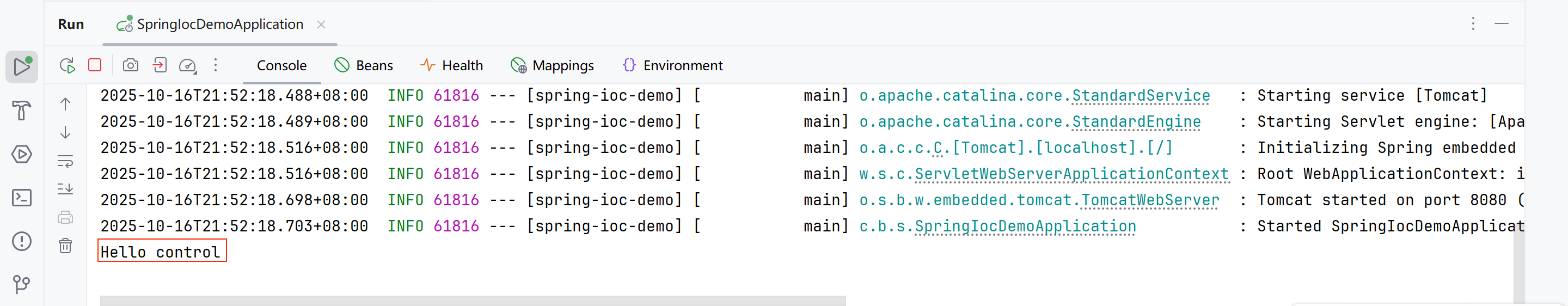 public class SpringIocDemoApplication {public static void main(String[] args) {//获取Spring上下文对象ApplicationContext context = SpringApplication.run(SpringIocDemoApplication.class, args);//从Spring上下文中获取对象HelloController bean = context.getBean(HelloController.class);//使用对象bean.print();}