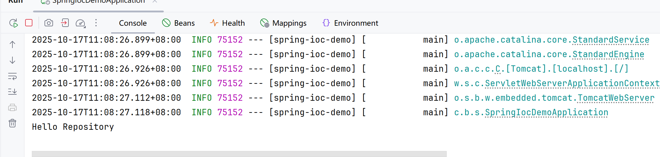 public class SpringIocDemoApplication {public static void main(String[] args) {ApplicationContext context = SpringApplication.run(SpringIocDemoApplication.class, args);UserRepository bean = context.getBean(UserRepository.class);bean.print();}
