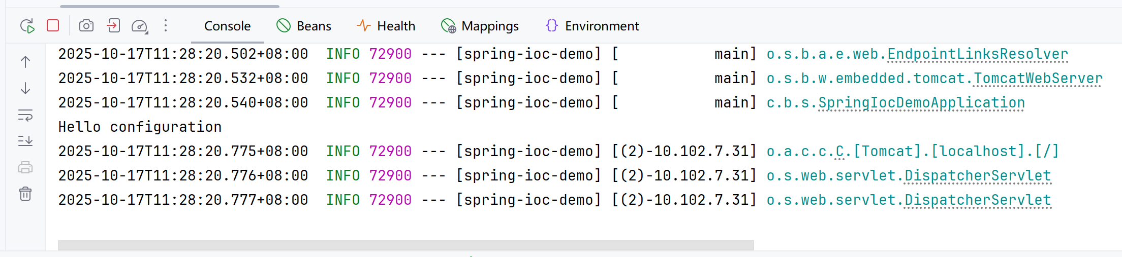 public class SpringIocDemoApplication {public static void main(String[] args) {ApplicationContext context = SpringApplication.run(SpringIocDemoApplication.class, args);UserConfig bean = context.getBean(UserConfig.class);bean.print();}