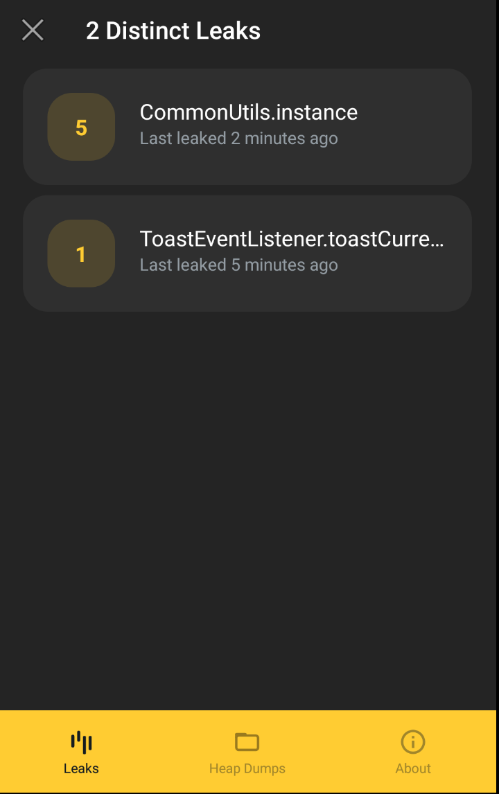 2022-04-17 22:54:30.469 10417-10512/com.arthur.leakcanary D/LeakCanary: ====================================HEAP ANALYSIS RESULT====================================1 APPLICATION LEAKSReferences underlined with "~~~" are likely causes.Learn more at https://squ.re/leaks.110763 bytes retained by leaking objectsSignature: dca112f2558c9868d2758a5e63f2a4db56cdf4a4┬───│ GC Root: Input or output parameters in native code│├─ android.os.MessageQueue instance│ Leaking: NO (MessageQueue#mQuitting is false)│ HandlerThread: "main"│ ↓ MessageQueue[0]│ ~~~├─ android.os.Message instance│ Leaking: UNKNOWN│ Retaining 110.9 kB in 1269 objects│ Message.what = 1│ Message.when = 60449259 (40171 ms after heap dump)│ Message.obj = null│ Message.callback = null│ Message.target = instance @315500656 of com.arthur.leakcanary.MainActivity$1│ ↓ Message.target│ ~~~~~~├─ com.arthur.leakcanary.MainActivity$1 instance│ Leaking: UNKNOWN│ Retaining 110.8 kB in 1268 objects│ Anonymous subclass of android.os.Handler│ this$0 instance of com.arthur.leakcanary.MainActivity with mDestroyed = true│ ↓ MainActivity$1.this$0│ ~~~~~~╰→ com.arthur.leakcanary.MainActivity instance Leaking: YES (ObjectWatcher was watching this because com.arthur.leakcanary.MainActivity received Activity#onDestroy() callback and Activity#mDestroyed is true) Retaining 110.8 kB in 1267 objects key = f862522b-3d28-46c7-b9d9-9af326045f1c watchDurationMillis = 5137 retainedDurationMillis = 131 mApplication instance of com.arthur.leakcanary.MyApp mBase instance of android.app.ContextImpl====================================0 LIBRARY LEAKSA Library Leak is a leak caused by a known bug in 3rd party code that you do not have control over.See https://square.github.io/leakcanary/fundamentals-how-leakcanary-works/#4-categorizing-leaks====================================0 UNREACHABLE OBJECTSAn unreachable object is still in memory but LeakCanary could not find a strong reference pathfrom GC roots.====================================METADATAPlease include this in bug reports and Stack Overflow questions.Build.VERSION.SDK_INT: 27Build.MANUFACTURER: GoogleLeakCanary version: 2.8.1App process name: com.arthur.leakcanaryStats: LruCache[maxSize=3000,hits=17013,misses=30442,hitRate=35%]RandomAccess[bytes=1532541,reads=30442,travel=6832412172,range=8829641,size=11484945]Heap dump reason: 2 retained objects, app is not visibleAnalysis duration: 2346 msHeap dump file path: /storage/emulated/0/Download/leakcanary-com.arthur.leakcanary/2022-04-17_22-54-26_679.hprofHeap dump timestamp: 1650207270389Heap dump duration: 753 ms====================================