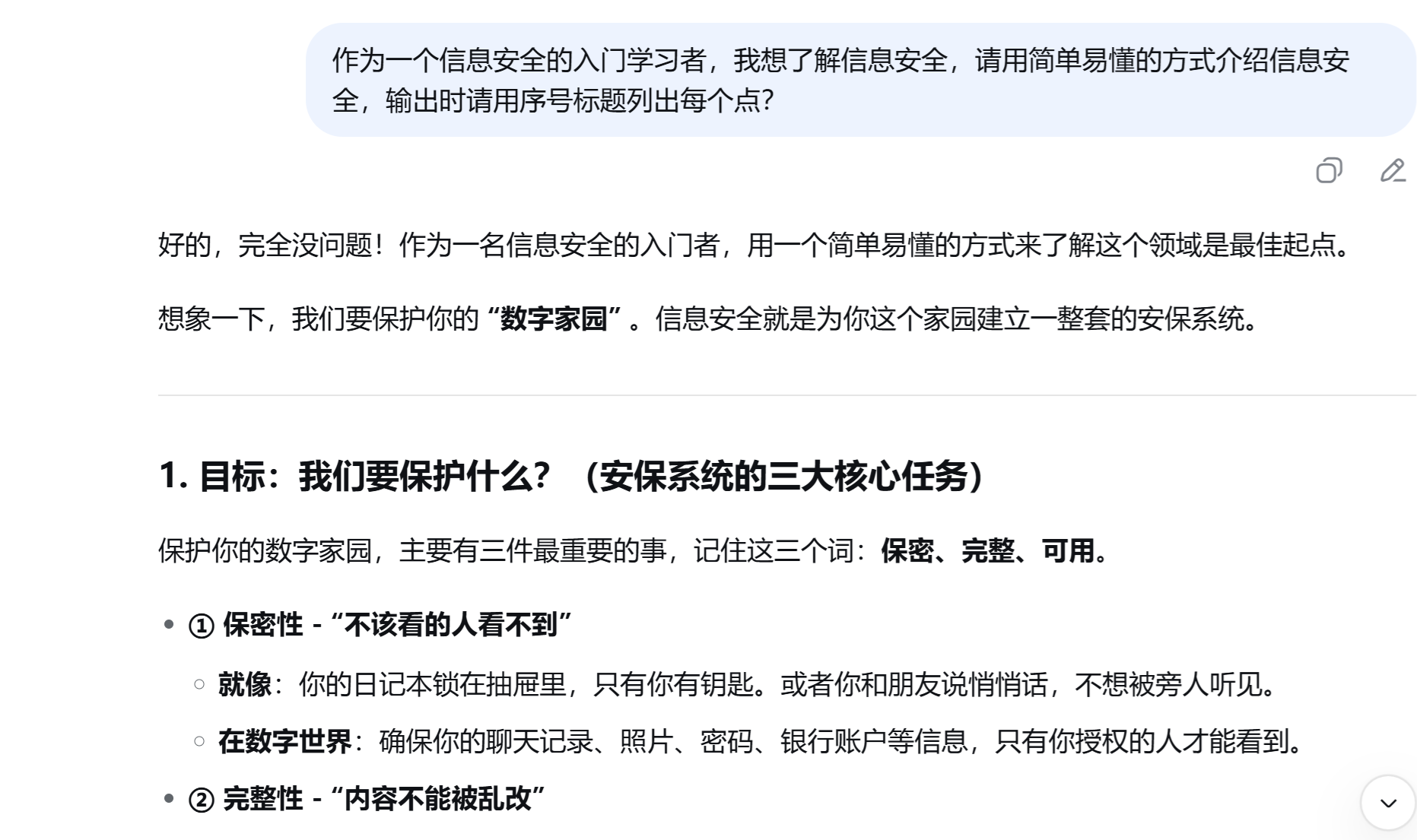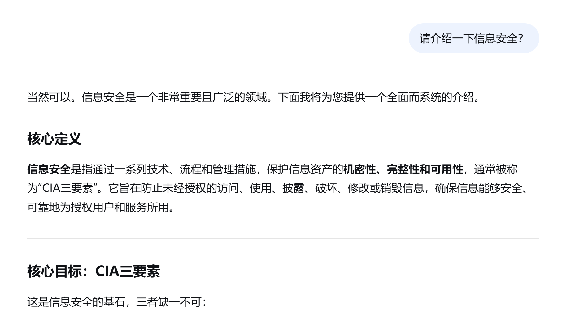 下面时一个想了解什么是信息安全的例子,通过不同的问法,可以看到答复的内容和格式是不一样的: