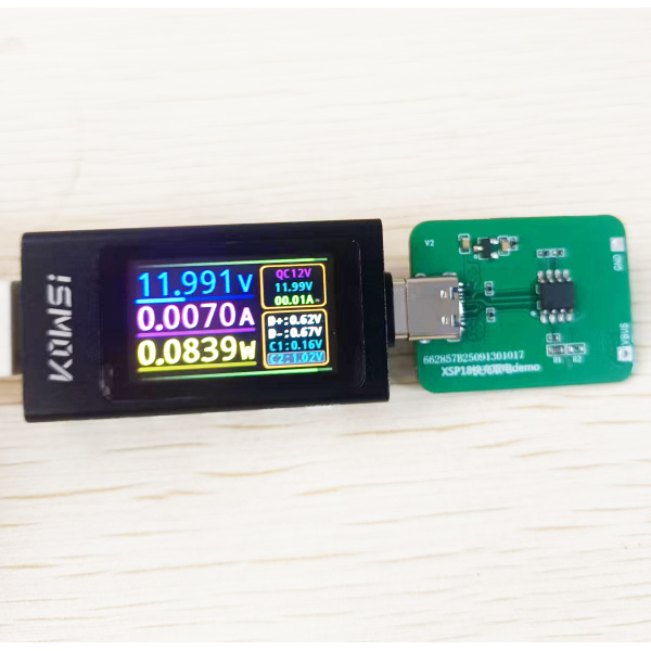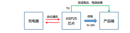 将外部 MCU芯片的RX 连接 XSP25的TX 接口,刚上电时,将外部 MCU的串口设置为高阻态,不能给 XSP25 的串口电压,否则会影响到芯片取电,等待 3-4 秒左右即可读取,外部设备的 MCU 读取到功率信息后,可以根据充电器的功率调整负载的大小。