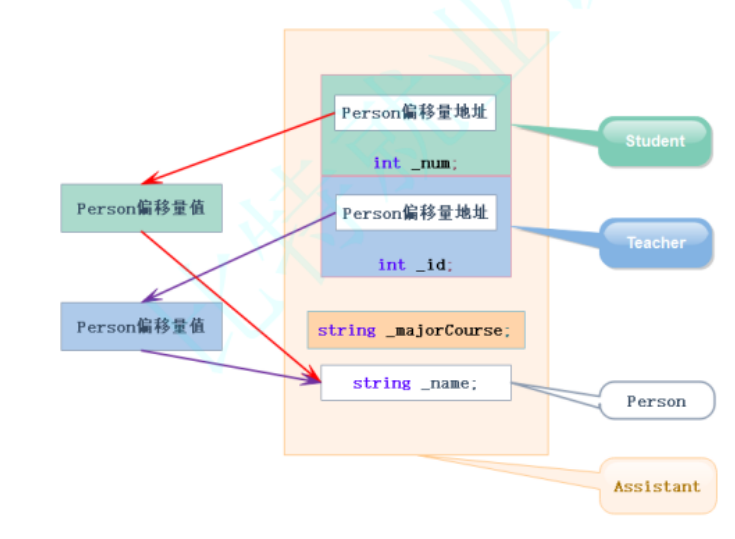 };// 底层子类:Assistant(多继承Student和Teacher)→ 菱形继承