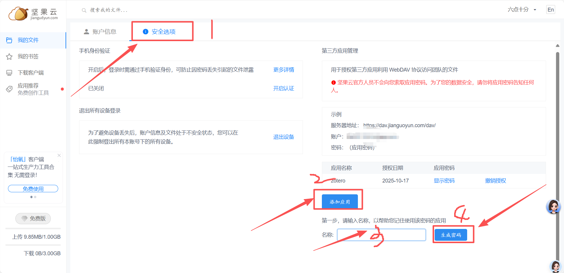 原因:认证时的密码并不是坚果云账号的密码,而是要在坚果云网页端进行【第三方应用管理】的设置,获取对应的密码。