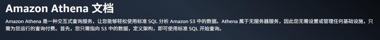 3. Amazon Athena:一种无服务器的交互式查询服务,能够快速分析亚马逊S3存储桶中的数据,Amazon Athena 还可使用 Apache Spark 以交互方式轻松运行数据分析,无需规划、配置或管理资源。