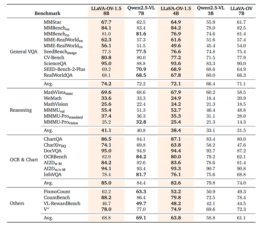 下表对比 LLaVA-OneVision-1.5 与 Qwen2.5-VL 在四大任务类别上的表现: