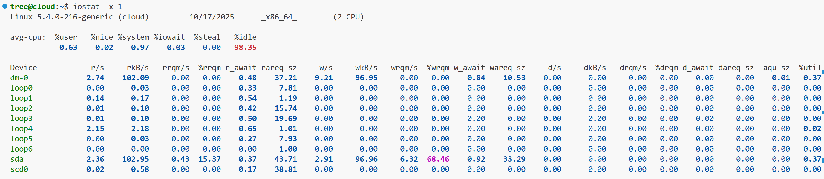 iostat -xz 1:看 %util:设备利用率,接近100%表示设备饱和。看 await:I/O 请求的平均等待时间(毫秒)。如果这个值很高(如 >10ms),说明磁盘响应慢。看 r/s, w/s:每秒的读写请求数。