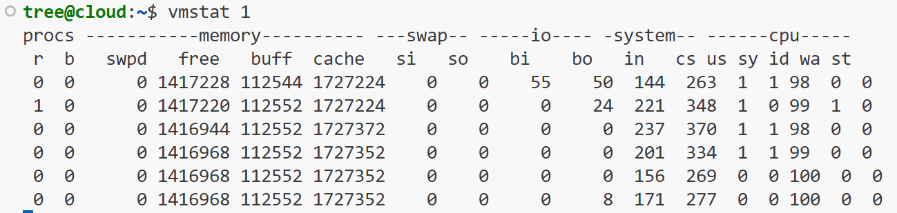 vmstat 1:查看系统范围(system)的CPU上下文切换 (cs) 和中断 (in),如果过高,可能是由过多进程调度导致。1是1s,可根据需要调整时间间隔。