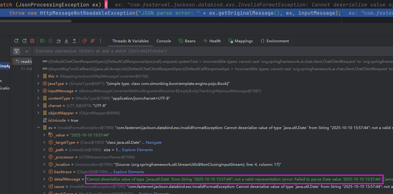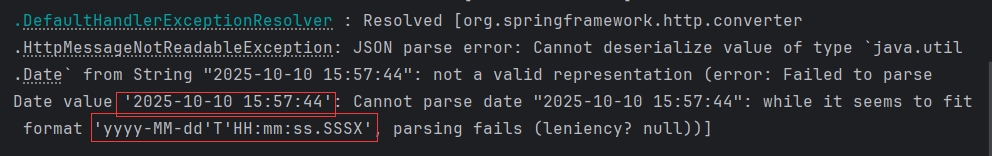 参数。但是接收参数过程中,唯独日期类型的参数总是出现解析异常。如下图: