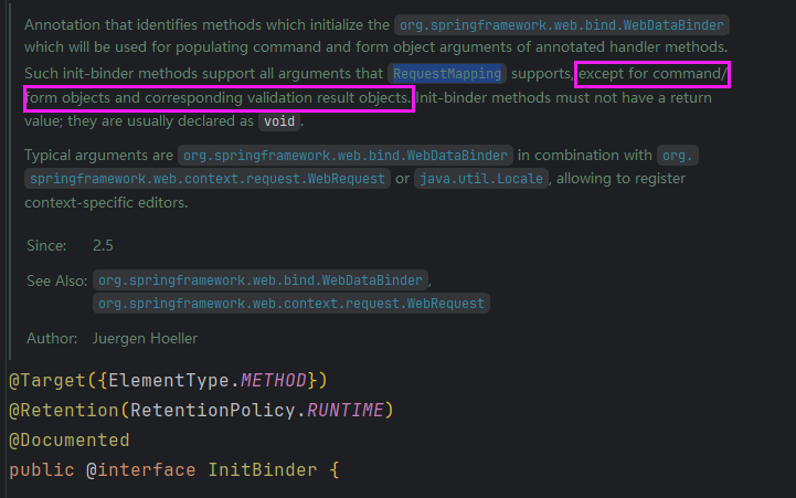 public class GlobalWebBinderHandler {/*** 处理web的data数据,这里主要处理form表单的日期*/@InitBinderpublic void globalWebDataBinder(WebDataBinder binder){binder.registerCustomEditor(Date.class, new PropertyEditorSupport() {@Overridepublic void setAsText(String text) throws IllegalArgumentException {Date date = null;try {if (StringUtils.isNotBlank(text)) {if (StringUtils.isNumeric(text)) {date = Date.from(Instant.ofEpochMilli(Long.parseLong(text)));}else {date = DateUtil.parseDate(text);}}} catch (ParseException e) {log.warn("web 日期参数解析异常,异常格式:{}, 支持的日期格式:{}", text, JSON.toJSONString(DateUtil.GENERIC_DATE_PATTERNS));}setValue(date);}});}