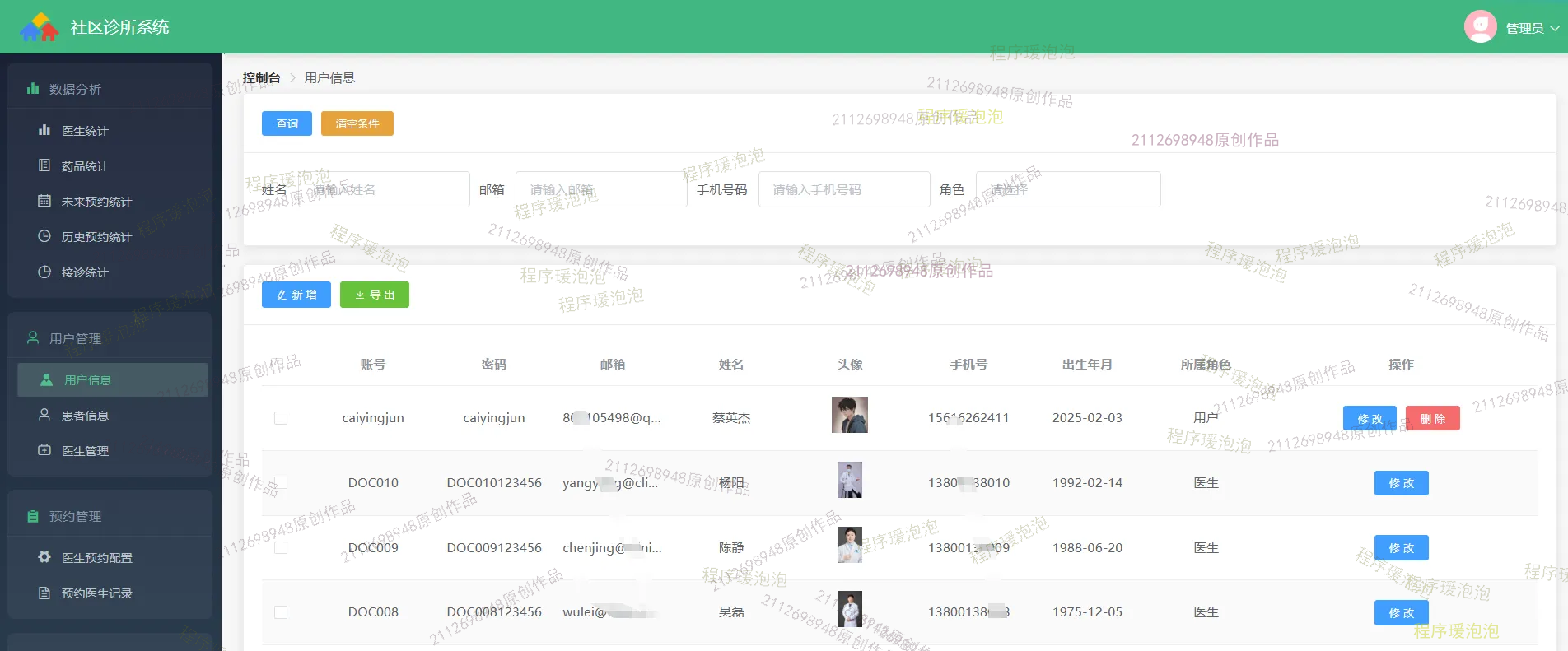 2) 用户管理:管理用户的基本信息,进行增删改查操作,导出用户数据。