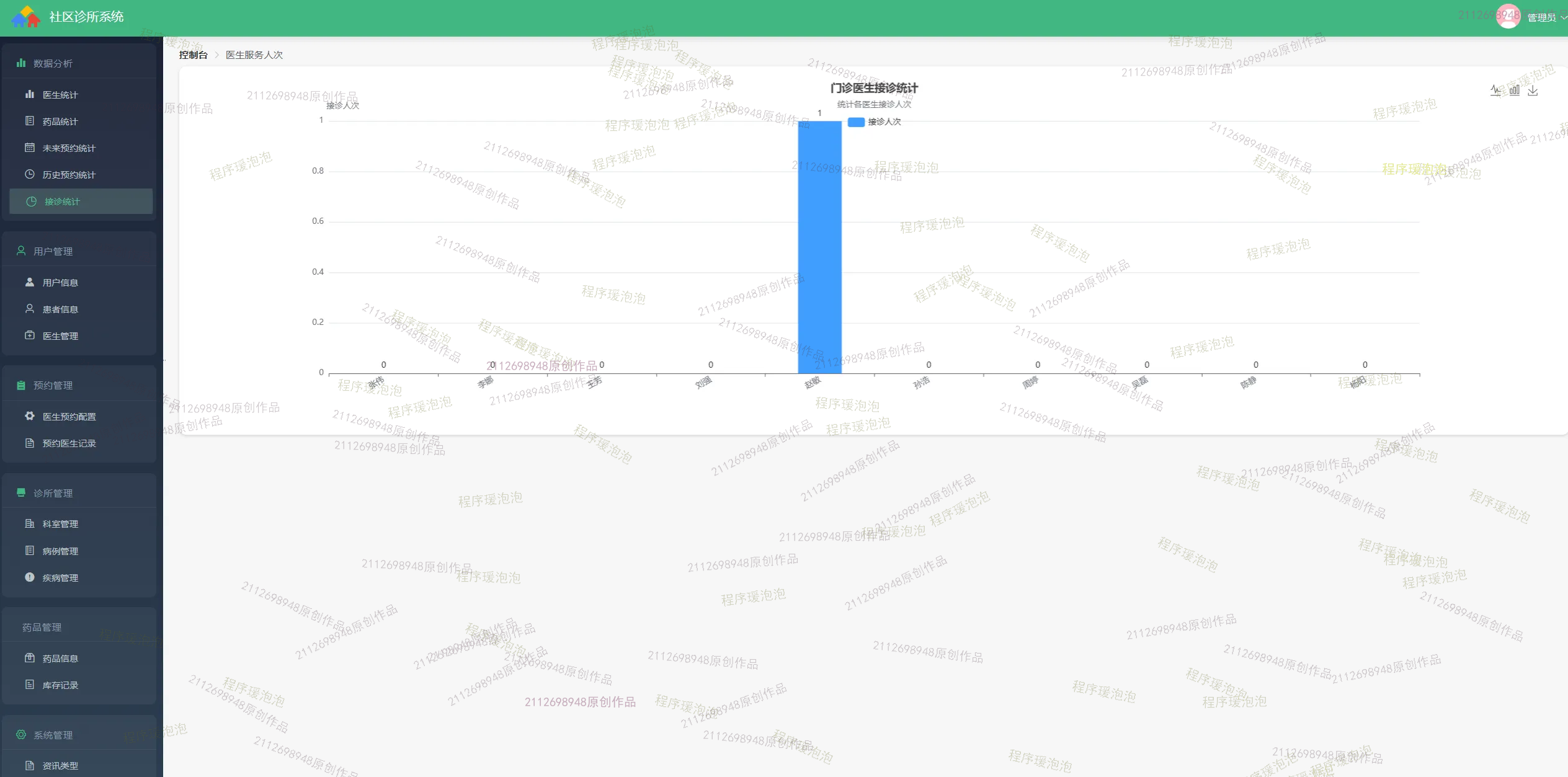 5) 诊疗数据统计:管理员可以查看所有医生的诊疗数据,如每日、每周、每月的接诊人数、不同疾病的诊疗数量等。