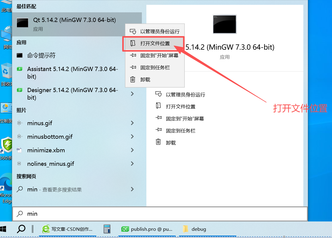 选取和编译器匹配的MinGW,搜索里输入min会出现下图,右键打开文件位置