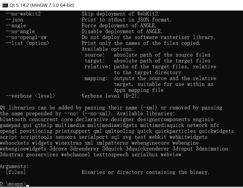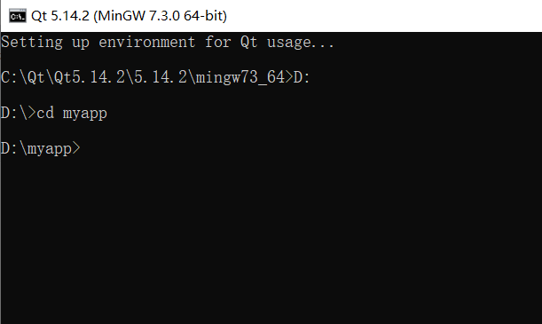 将release的exe拷贝到D:\myapp文件夹,启动Qt 5.14.2 (MinGW 7.3.0 64-bit),切换到该目录。