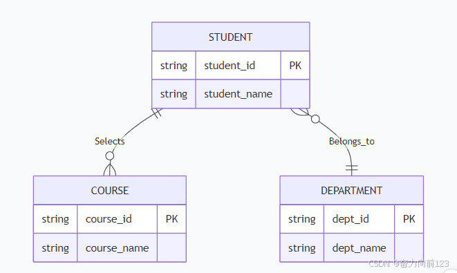 举例:一个学生可以选修多门课程,一门课程可以被多个学生选修。(“选修”联系是m:n)