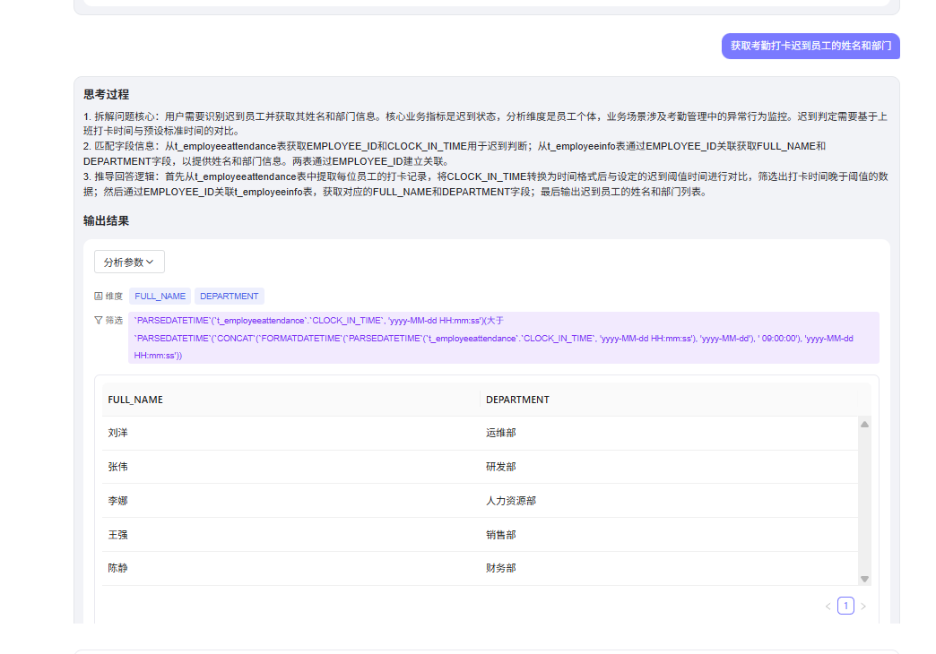 2025-10-17T08:31:30.005Z INFO 46 --- [genie-backend] [48.237:1601/...] com.jd.genie.service.Nl2SqlService : 86f76794-e83c-42b3-9958-53904409e6f0,86f76794-e83c-42b3-9958-53904409e6f0 SSE数据结果:{"code": 200, "data": [{"query": "获取考勤打卡迟到员工的姓名和部门", "nl2sql": "SELECT DISTINCT `t_employeeinfo`.`FULL_NAME`, `t_employeeinfo`.`DEPARTMENT` FROM `t_employeeinfo` INNER JOIN `t_employeeattendance` ON `t_employeeinfo`.`EMPLOYEE_ID` = `t_employeeattendance`.`EMPLOYEE_ID` WHERE PARSEDATETIME(`t_employeeattendance`.`CLOCK_IN_TIME`, 'yyyy-MM-dd HH:mm:ss') > PARSEDATETIME(CONCAT(FORMATDATETIME(PARSEDATETIME(`t_employeeattendance`.`CLOCK_IN_TIME`, 'yyyy-MM-dd HH:mm:ss'), 'yyyy-MM-dd'), ' 09:00:00'), 'yyyy-MM-dd HH:mm:ss')"}], "request_id": "86f76794-e83c-42b3-9958-53904409e6f0", "status": "data", "error_msg": ""}