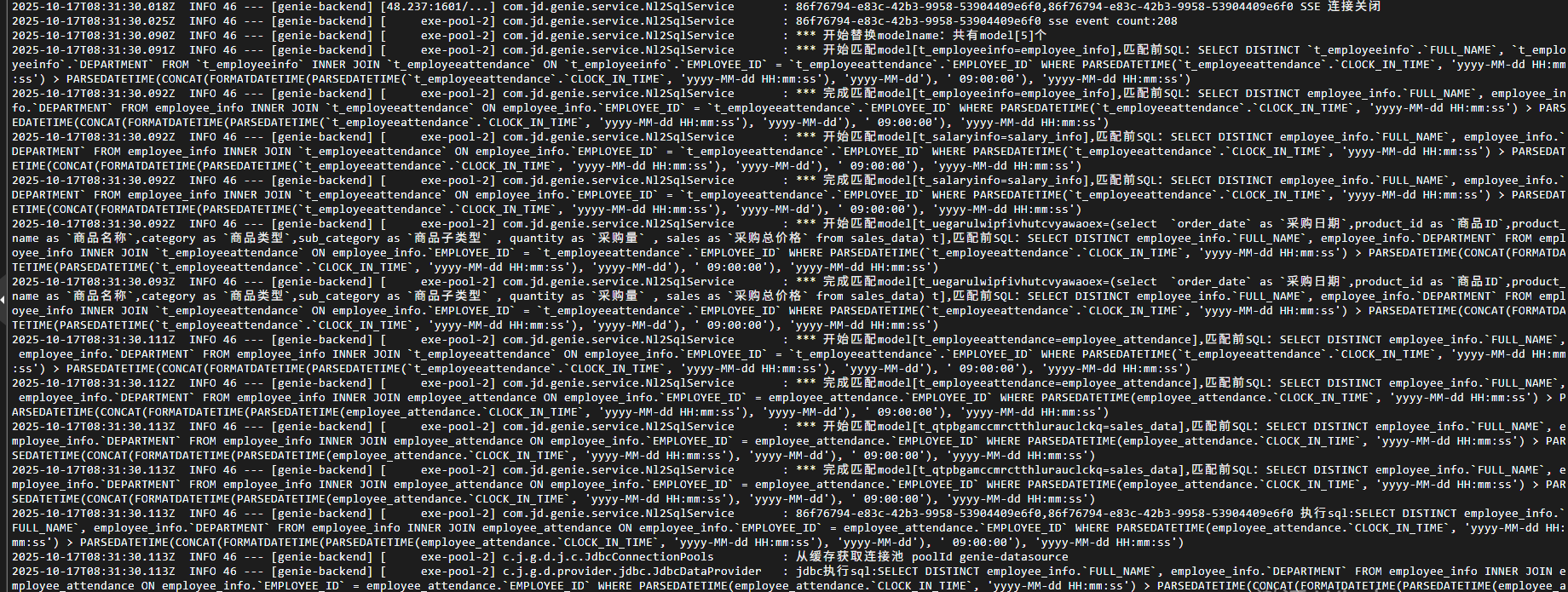 2025-10-17T08:31:30.018Z INFO 46 --- [genie-backend] [48.237:1601/...] com.jd.genie.service.Nl2SqlService : 86f76794-e83c-42b3-9958-53904409e6f0,86f76794-e83c-42b3-9958-53904409e6f0 SSE 连接关闭
