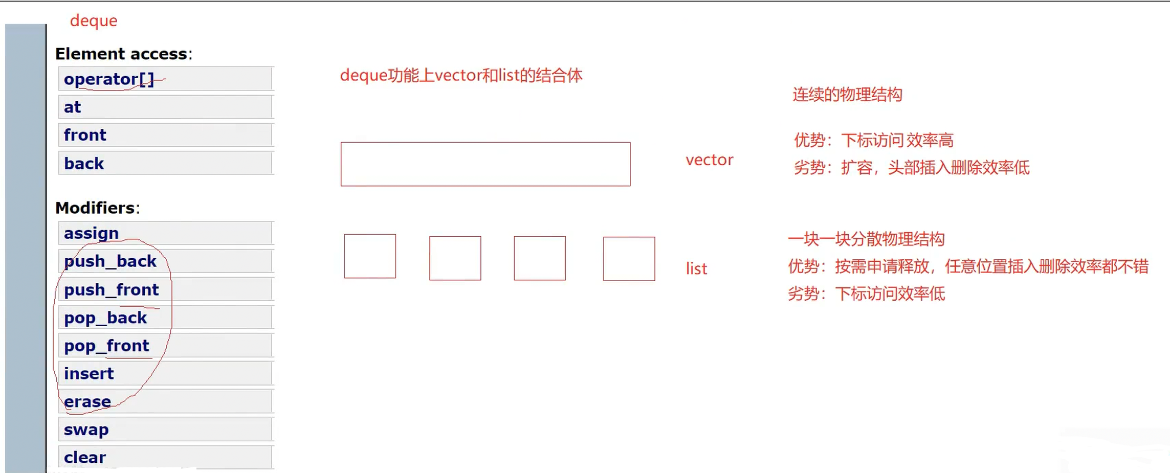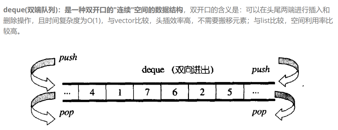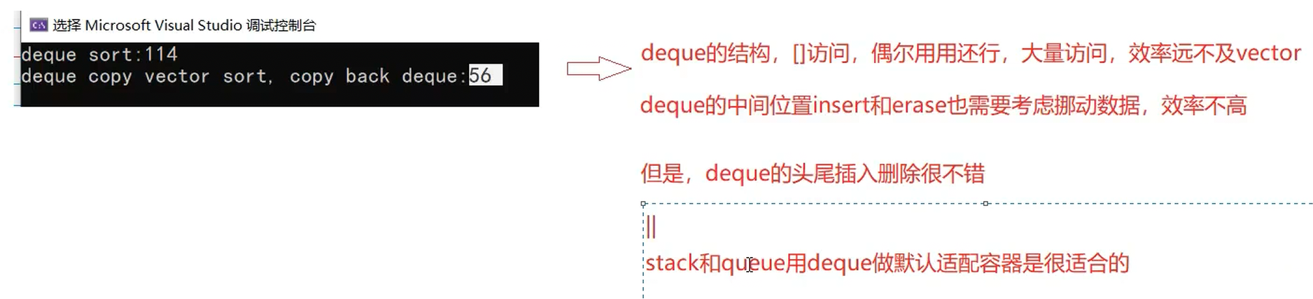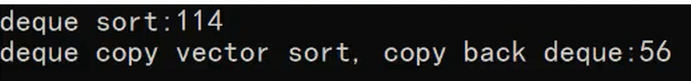 {srand(time(0));const int N = 1000000;deque<int> dq1;deque<int> dq2;for (int i = 0; i < N; ++i){auto e = rand() + i;dq1.push_back(e);dq2.push_back(e);}int begin1 = clock();sort(dq1.begin(), dq1.end());int end1 = clock();int begin2 = clock();// 拷贝到vectorvector<int> v(dq2.begin(), dq2.end());sort(v.begin(), v.end());dq2.assign(v.begin(), v.end());int end2 = clock();printf("deque sort:%d\n", end1 - begin1);printf("deque copy vector sort, copy back deque:%d\n", end2 - begin2);