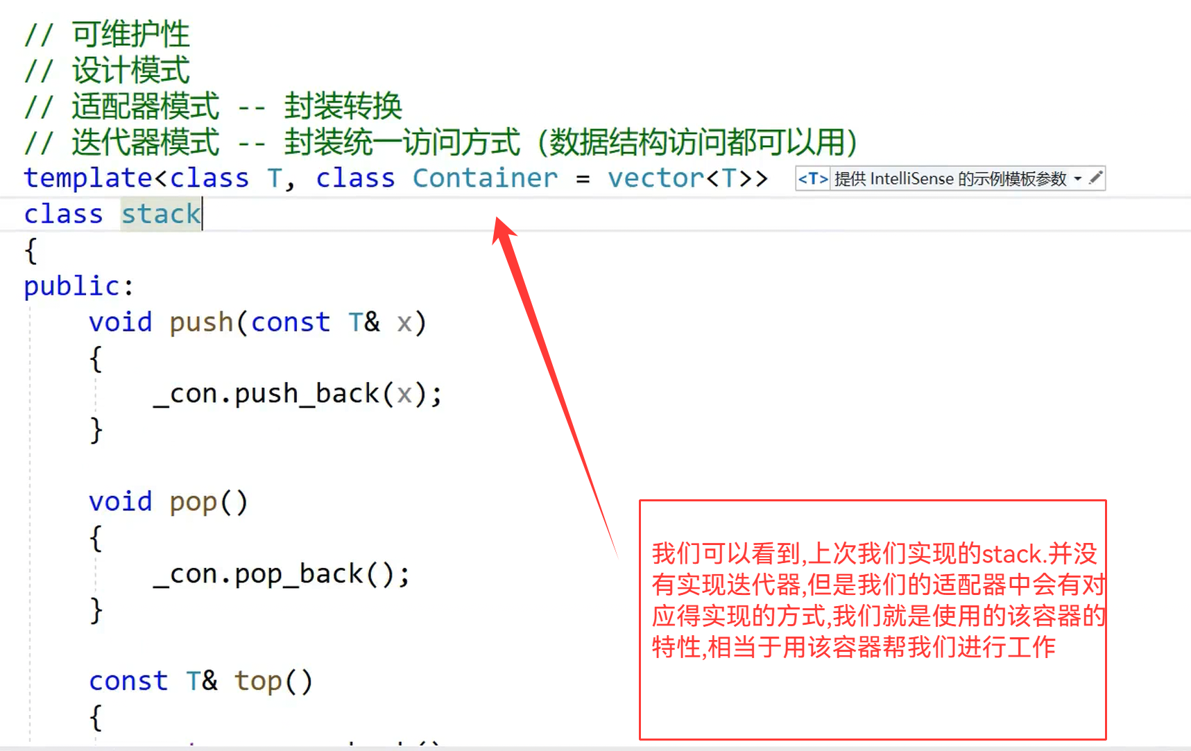{// deque list// 不支持vector(vector没有直接支持头删(效率太低了))template<class T, class Container = deque<T>>class queue{public:void push(const T& x){_con.push_back(x);}void pop(){_con.pop_front();// 这样就可以支持vector了,但是效率就很低了//_con.erase(_con.begin());}const T& back(){return _con.back();}const T& front(){return _con.front();}bool empty(){return _con.empty();}size_t size(){_con.size();}private:Container _con;};