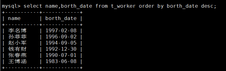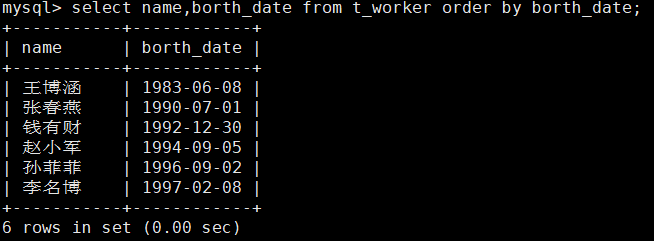 mysql> select name,borth_date from t_worker order by borth_date;(顺序排列)