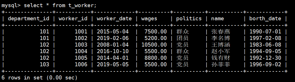 Query OK, 1 row affected (0.01 sec)mysql> insert into t_worker values (103,1006,'2019-5-5',5500,'党员','孙菲菲','1996-9-2');