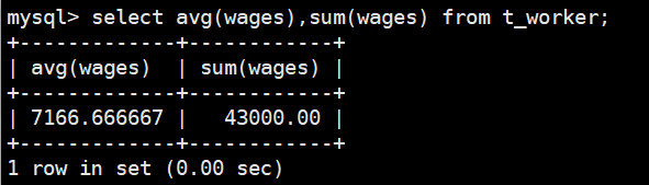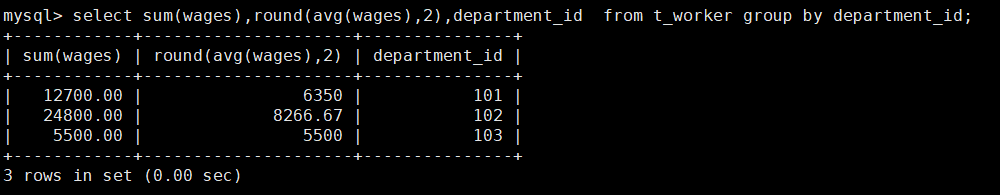 mysql> select sum(wages),round(avg(wages),2),department_id from t_worker group by department_id;